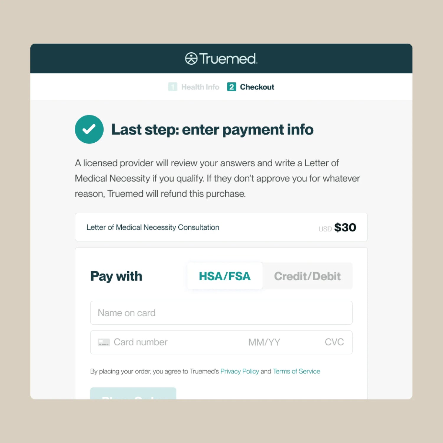 Youāll enter your payment info and complete checkout. For the best experience, we recommend using a regular credit/debit card you can then get reimbursed through your HSA/FSA provider after purchase.