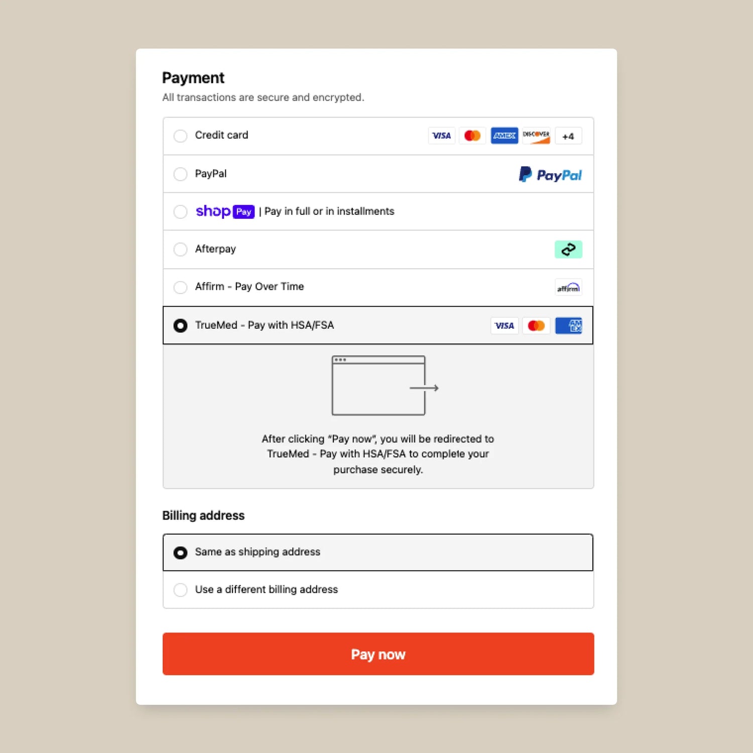When selecting a payment method, look for āTruemed ā Pay with HSA/FSAā. Click "Pay now" to continue.